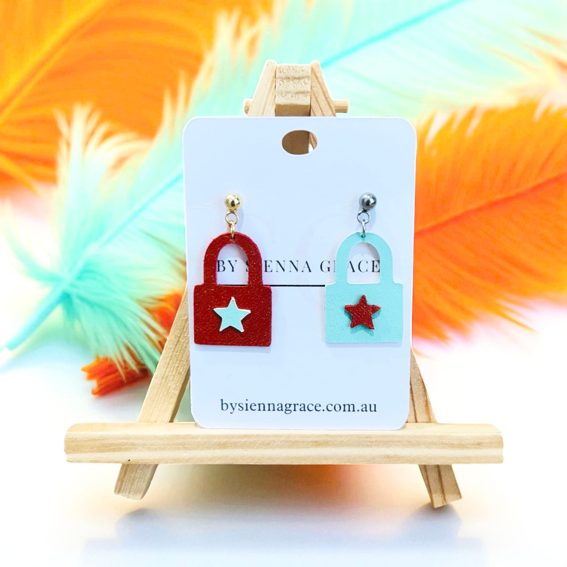 Handcrafted from genuine kangaroo leather, these playful lock-and-star earrings are topped with a stainless steel ball stud.