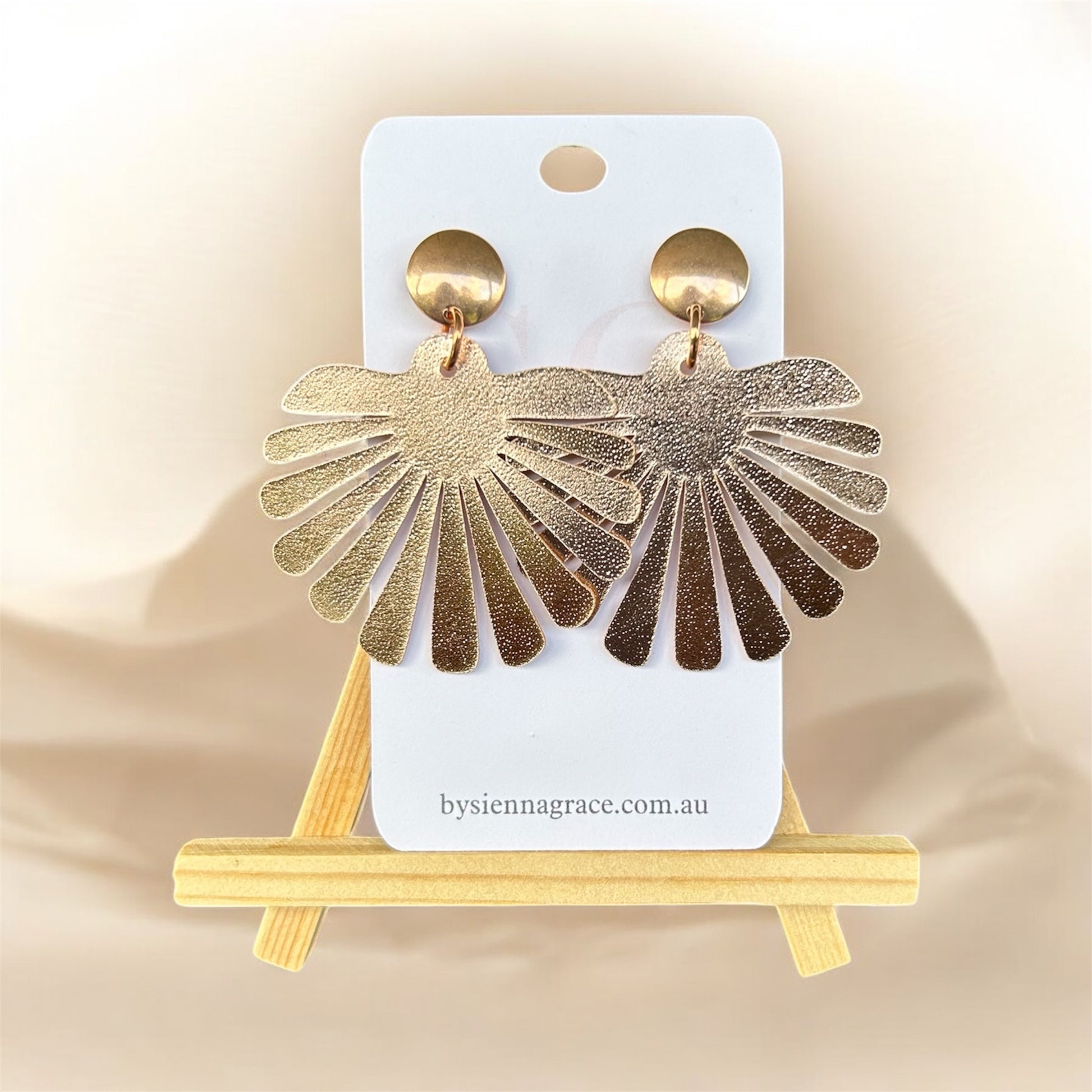 A textured fan-style drop with clean radiating cuts, paired with rose gold-plated stainless steel toppers.